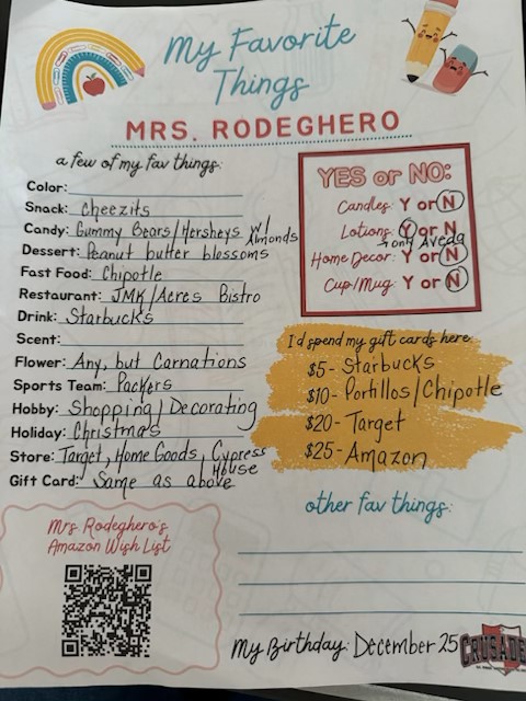 Many of our teachers have created Amazon Wish Lists as well as shared their Favorite Things. These are wonderful opportunities to support their classrooms and bless them personally throughout the school year.